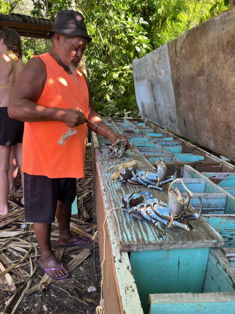 Cicerone primario e poi pranzo da Mata (5 pasti in uno, almeno 4 finiti in cambusa ) e gran finale con il packaging del papà di Mata di cinque belli e buoni coconut crab, trattati e congelati su lifexplorer.